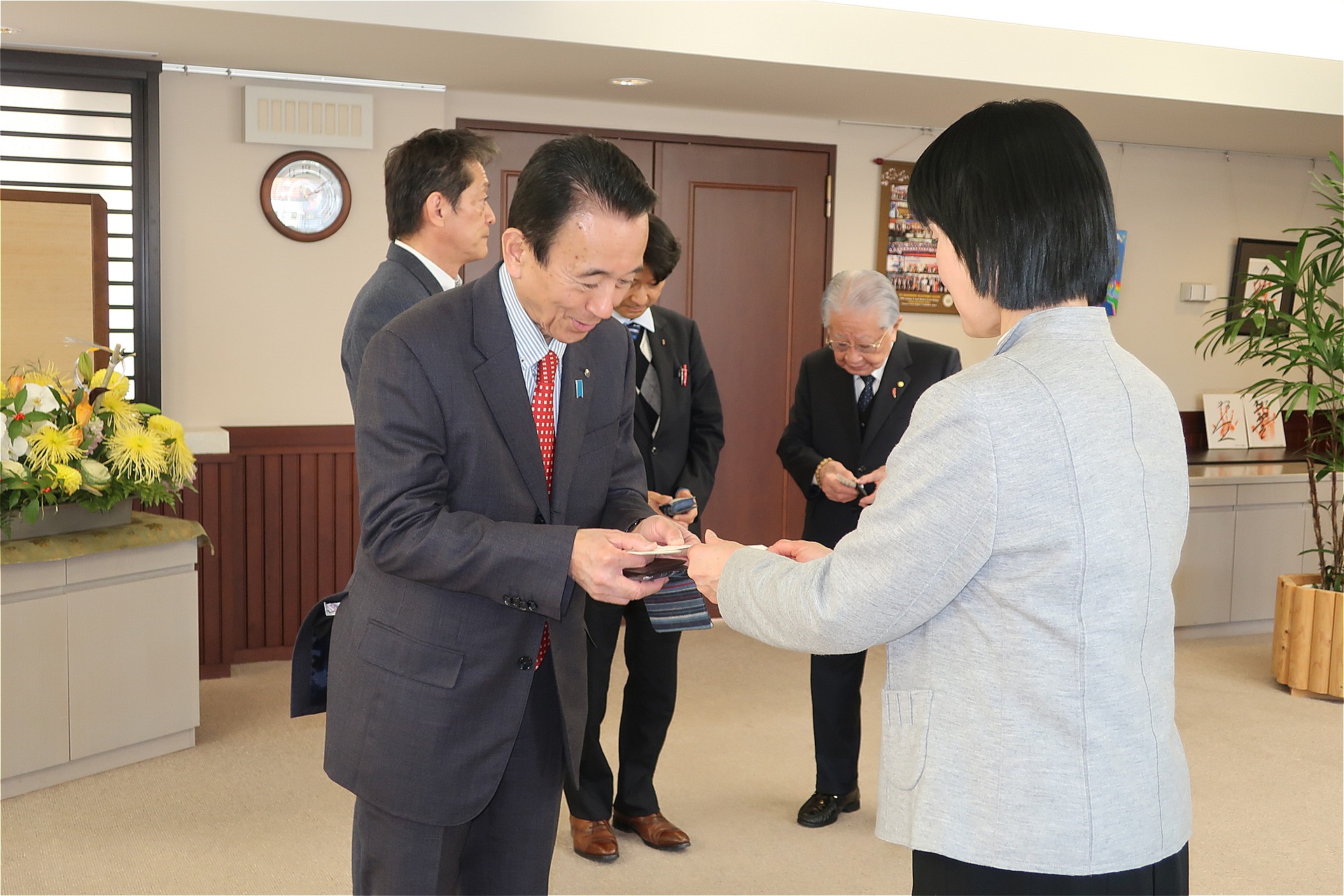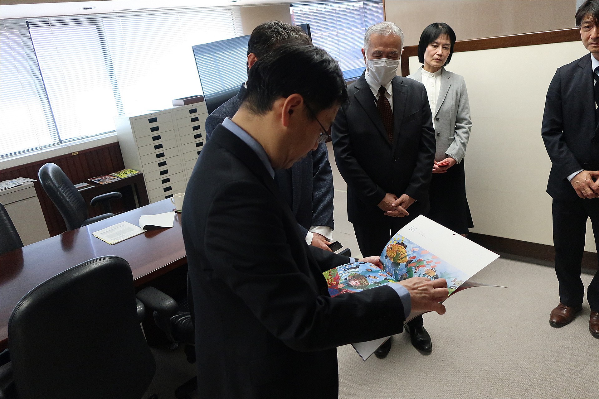 家込久志副会長から、鈴木知事に愛護ギャラリー展カレンダーを贈るとともに、