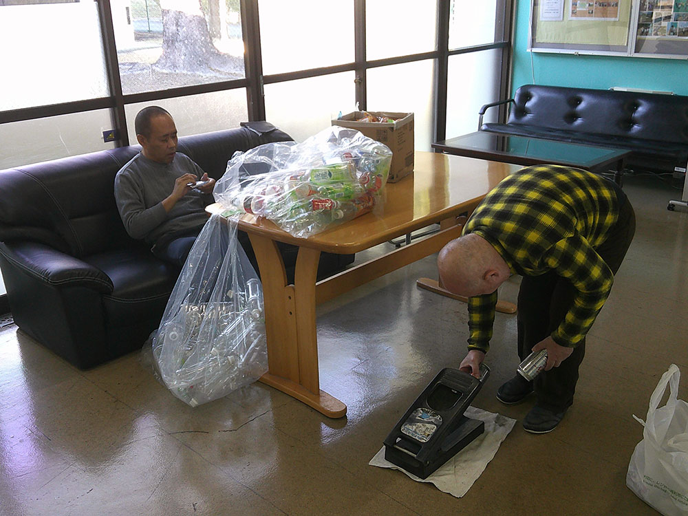 ご利用者が自立した日常生活又は社会生活を営むことができるよう、常時介護を要するご利用者に対して、入浴、排せつ又は食事の介護、創作的活動の提供を行っています。活動もご利用者1人1人のアセスメントを通してご本人の能力と興味のあるものを理解した上で提供しているとともに、シュレッダーや缶潰しといった作業要素を含めたものも提供しています。また、高齢の方や身体的機能が低下してきた方も多く入所されているところでは、天気が良い日は散歩に出掛け、雨の日でも回廊を歩いて体力維持に努めています。